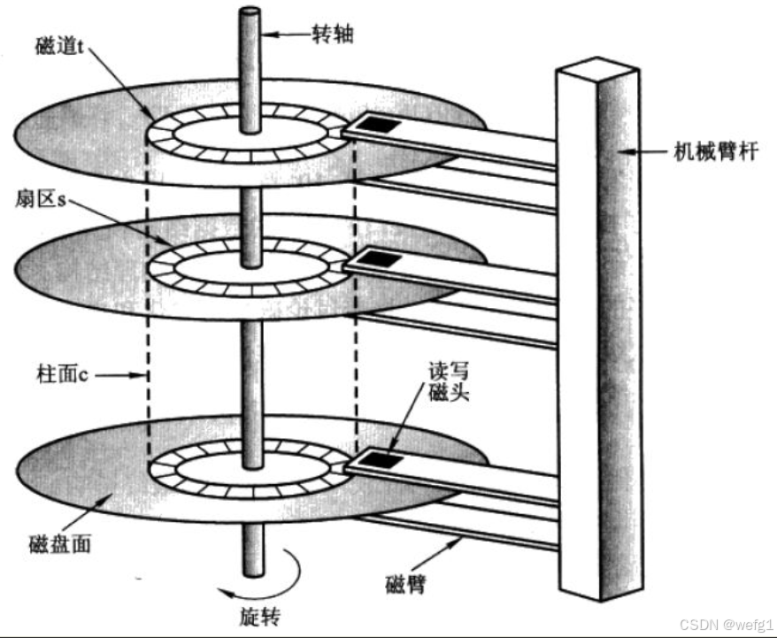 因为所有磁头同步移动,所以当磁头臂移动一次,所有磁头可以访问所有盘片上相同位置的磁道。数据常常按柱面组织,以减少磁头移动,提高效率。