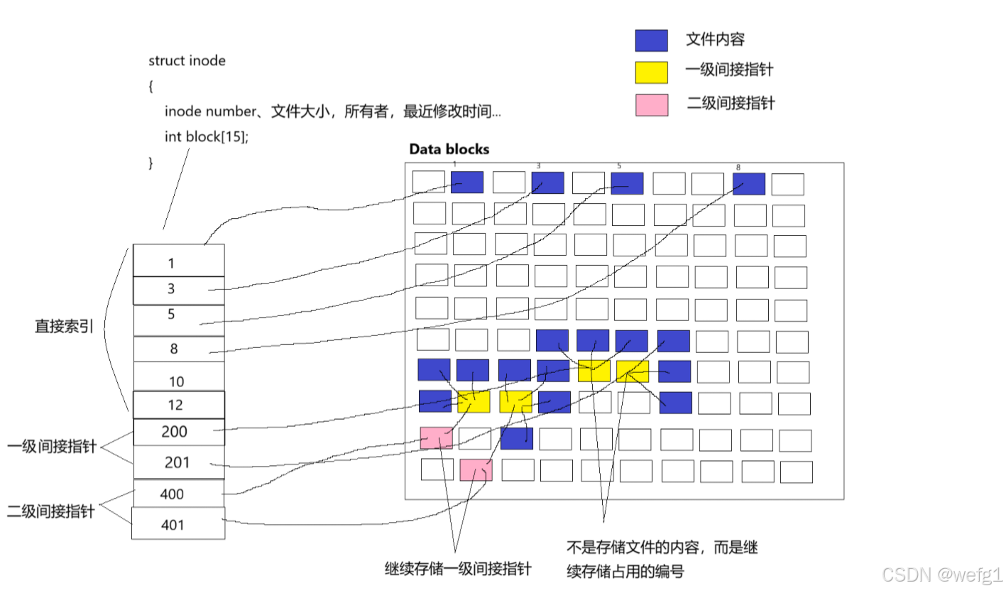 在磁盘上存储文件,就要存储文件的内容和属性,文件的内容是以数据块形式存储的,文件的属性是以 inode 形式存储的,即:文件的内容和属性是分开存储的。