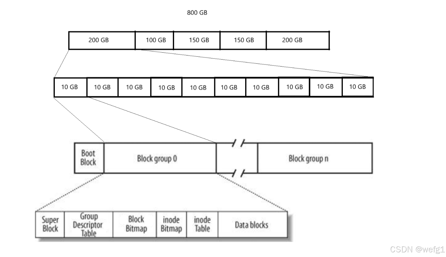 现在假设有一个容量为 800GB 的磁盘,直接管理所有不可行,可以把磁盘划分为任意大小的区域,比如划分为 200GB+100GB+150GB+150GB+200GB,类似于一个个省份,只要管理好了某个省份,就可以复制粘贴的管理好其他省份,整个磁盘就管理好了。直接管理一个省份也不可行,把省份继续划分,比如 200GB 划分为 20 个 10 GB(Block Group 块组),只要管理好任意一个 10 GB,就可以复制粘贴的管理好整个省份,就可以管理好整个磁盘。现在只要管理好这 10GB,可以管理好整个磁盘了,我们研究如何管理好这 10GB,把这 10GB 展开,就是文件系统: