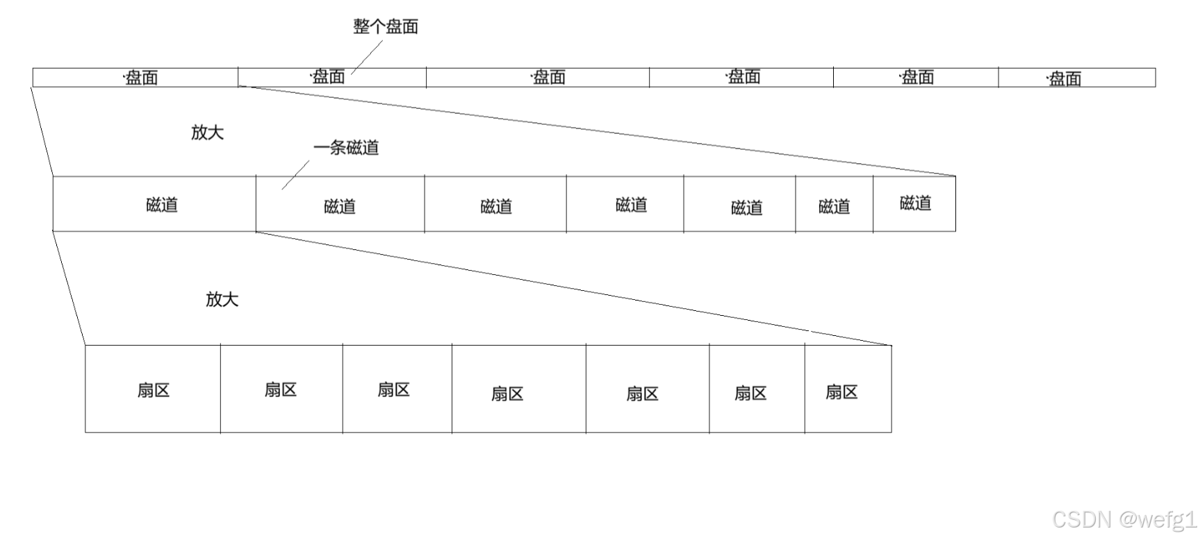 磁盘在物理上是圆的,但在逻辑上认为它是线性的,就像把磁带的磁条全部扯出来拉直一样。假设一个磁盘有 6 个盘面,把这 6 个盘面想象成盘卷的磁条,把它们拉直并首尾拼接起来: