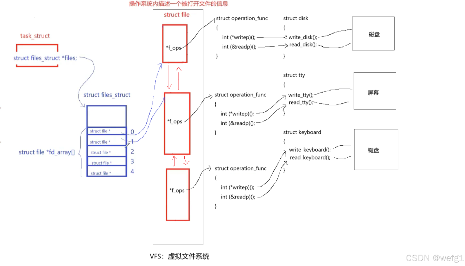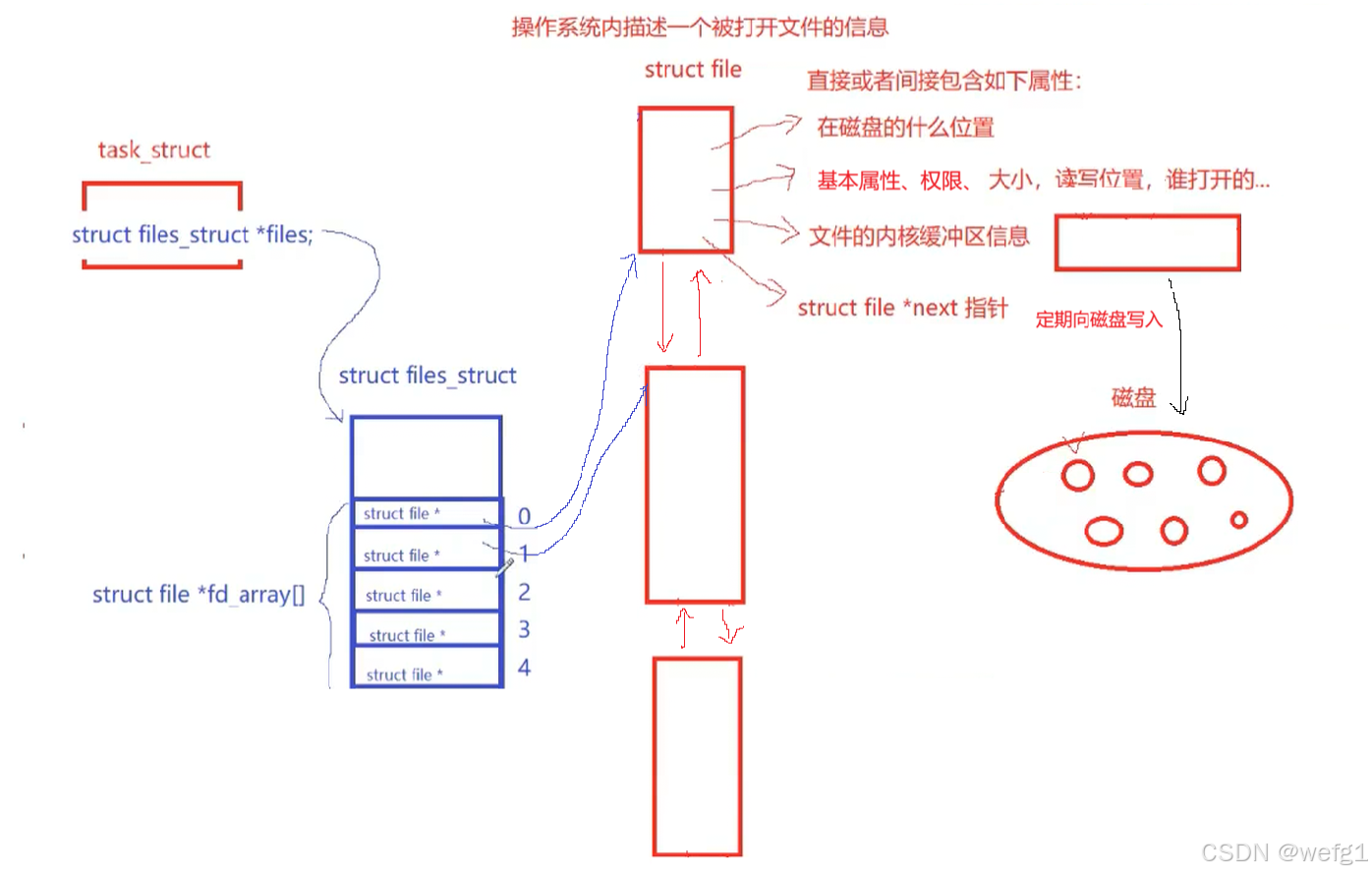 3、打开的文件:文件是进程打开的,研究打开的文件,就是研究进程与文件的关系。文件被打开,必须先加载到内存(文件的属性一定先加载到内存)。一个进程可以打开多个文件,所以操作系统内部一定有很多打开的文件。操作系统采用"先描述,再组织"的方式管理文件。