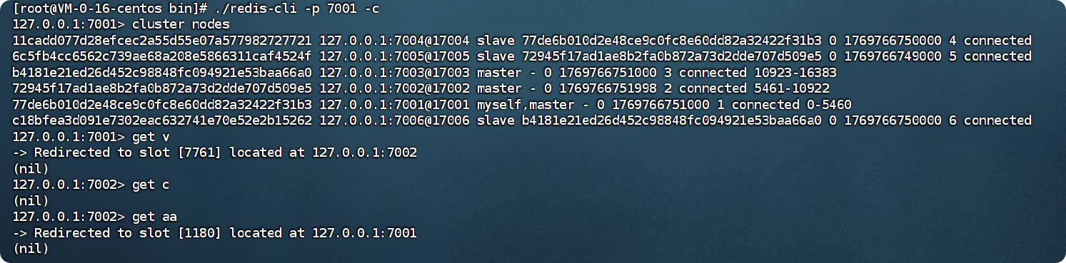 -c 表示集群模式 redis-cli表示client模式进入redis,-p表示端口号