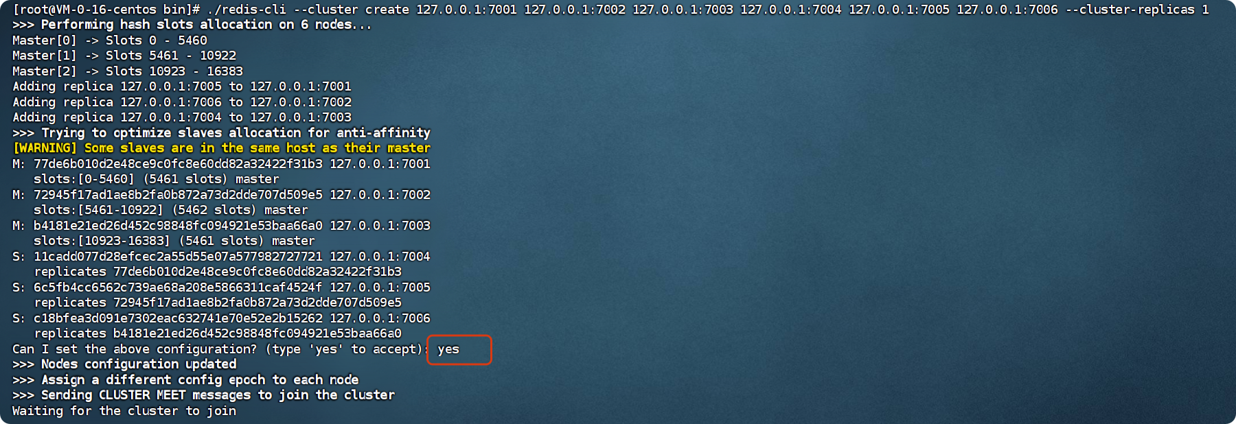 redis-cli --cluster create 127.0.0.1:7001 127.0.0.1:7002 127.0.0.1:7003 127.0.0.1:7004 127.0.0.1:7005 127.0.0.1:7006 --cluster-replicas 1
