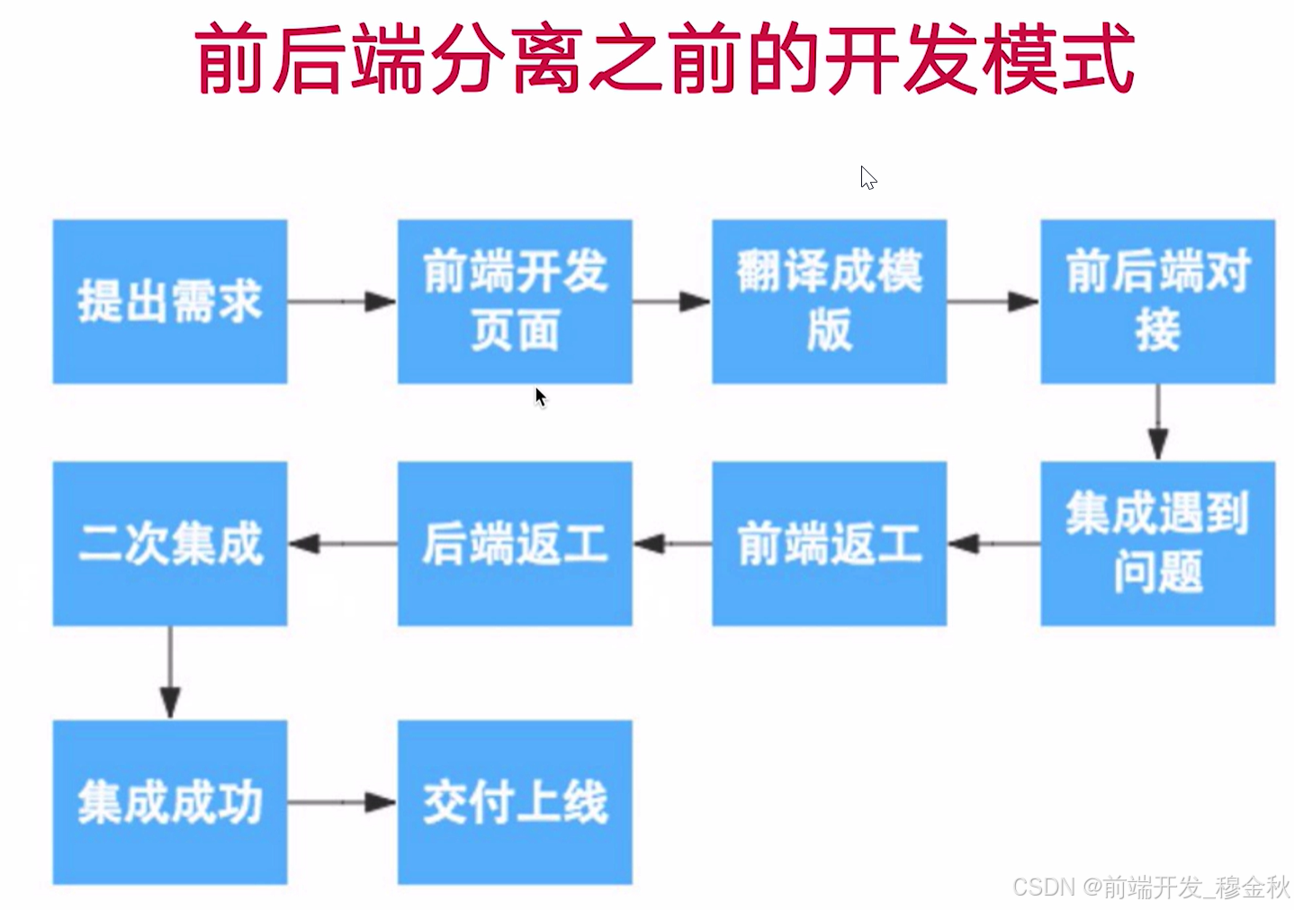这张图展示了前后端分离之前的开发模式,即传统Web开发中前端与后端紧密耦合的协作流程。整个流程是一个线性但容易出现反复迭代的开发路径,以下是该流程的详细说明: