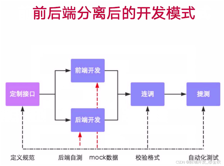 这是一张描述现代 Web 开发中"前后端分离架构"下典型协作流程的流程图。它展示了如何通过接口规范、Mock 数据和并行开发,实现前端与后端的高效解耦。