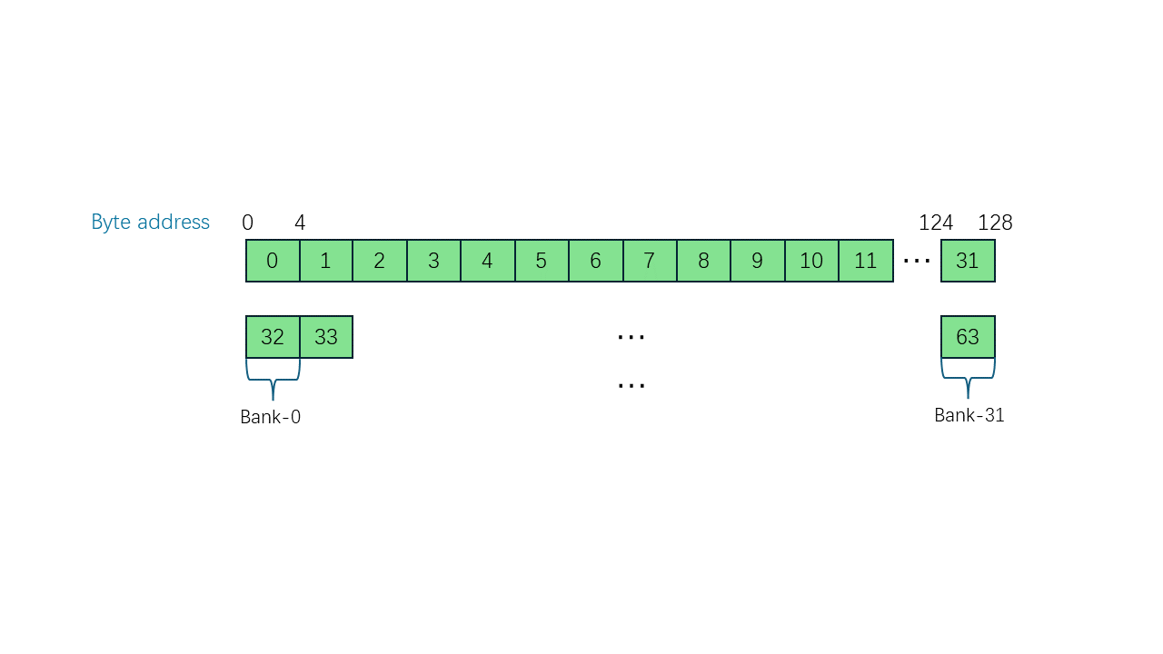 在一个block块中,共享内存被分为32个存储体(bank)如下图: