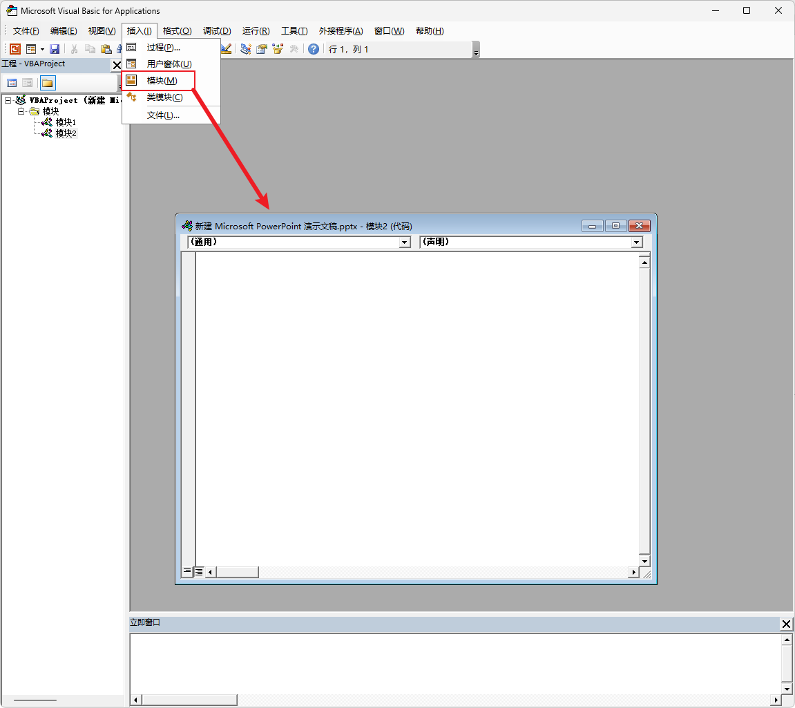 按插入--->模块弹出: