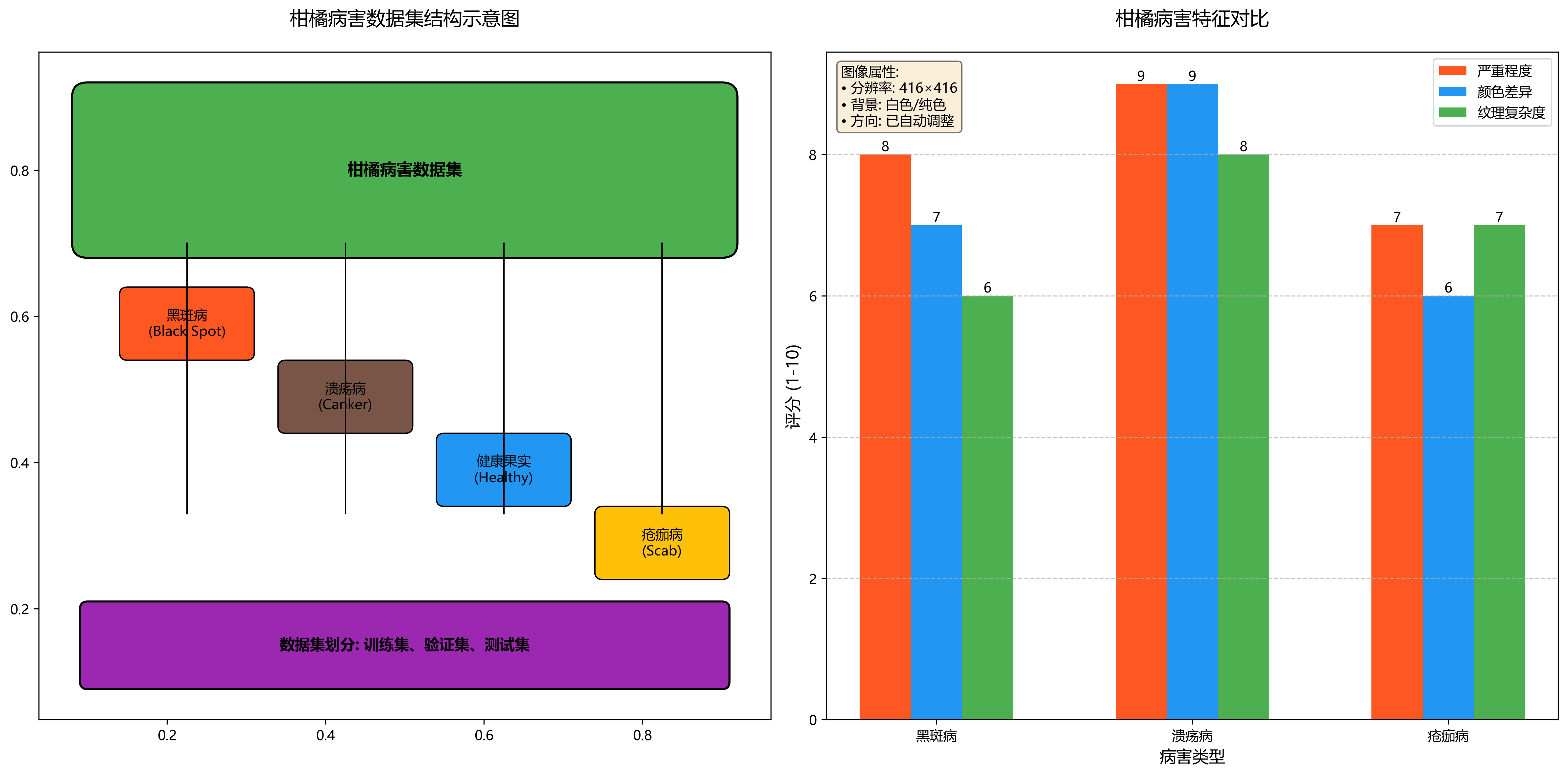 为了训练和评估模型,我们使用了COCO格式数据集,包含柑橘类水果的多种病害图像,每种病害都有精细的标注。数据集预处理包括图像增强、数据划分和格式转换等步骤。