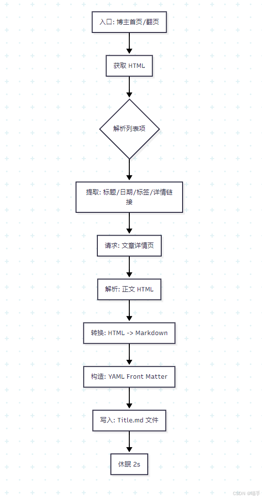 在这个项目中,我们不仅仅是在"抓数据",更是在做"数据格式化工程"。我们利用 CSS 选择器 快速切入 DOM 结构,利用 html2text 打通了 HTML 到 Markdown 的任督二脉,最终实现了一个具有实际生产价值的博客迁移工具。