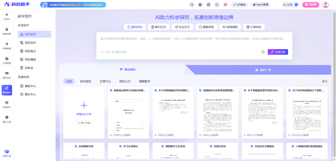 进入"研学创作"模块,可新建文档或导入已有稿件: