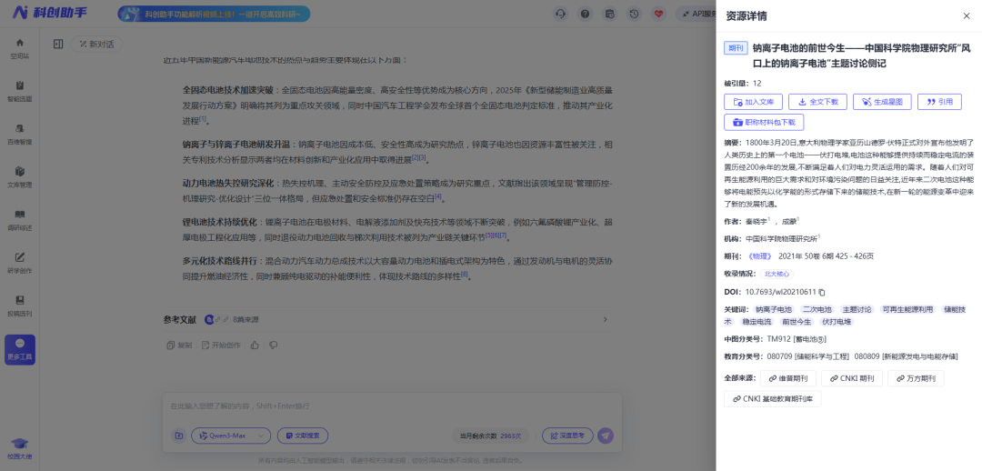 维普科创助手依托维普资讯30余年的中文科技文献积累(期刊、学位论文、专利、标准等10亿+条元数据),结合大模型技术,构建了真正意义上的"学术专用AI"。这与通用大模型最大区别在于:所有推荐、分析、生成内容均有真实文献支撑,可点击验证来源。