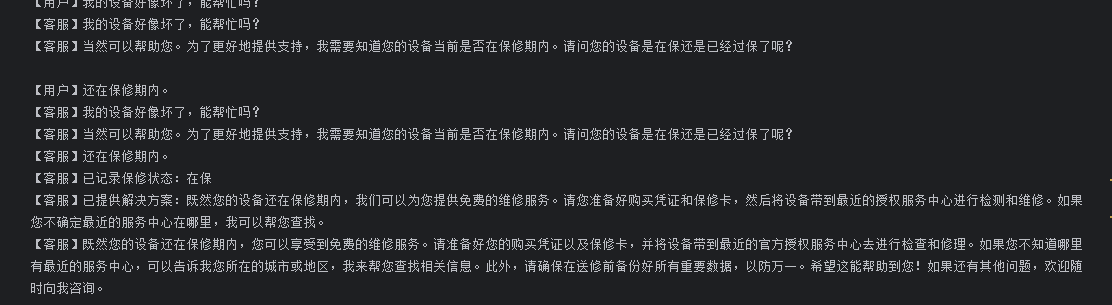 | 5 | "Here's the warranty repair process..." | 提供解决方案或转人工 | current_step = "Provide_resolution" |