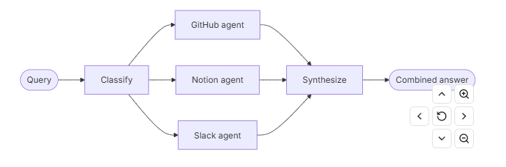 路由器分析了查询,将其分类以确定要调用的智能体(对于这个技术问题,是 GitHub 和 Notion,而不是 Slack),并行查询了这两个智能体,并将结果综合成一个连贯的答案。