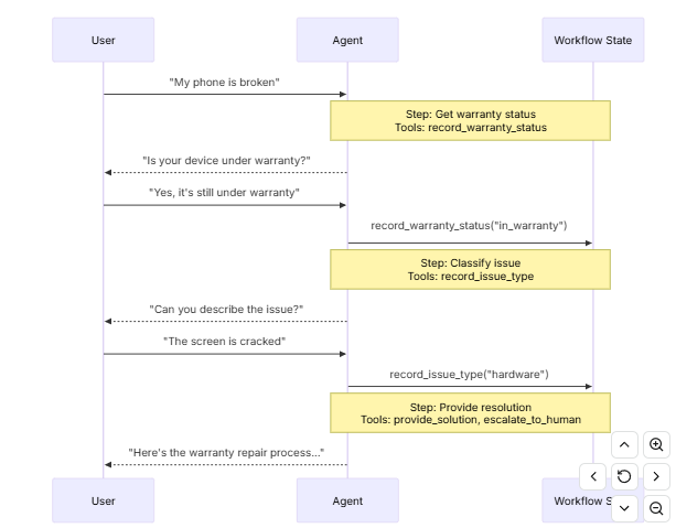 基于状态驱动的智能体工作流(State-Driven Workflow) ,用于处理用户设备保修问题。它清晰地体现了你之前提到的"交接架构"中的核心机制:通过持久化的流程状态(Workflow State)来动态调整智能体的行为、工具调用和交互逻辑。