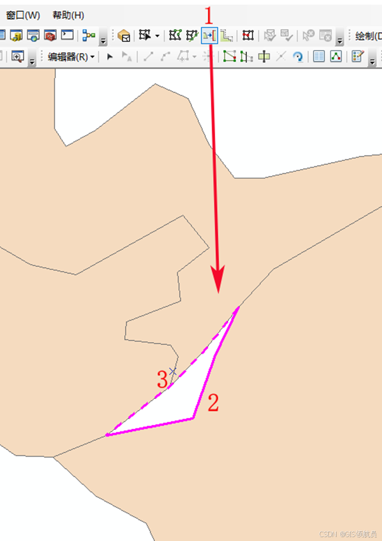 点击1处对齐边工具,点击2处缝隙边,出现粉色实线,移动到3处,3处缝隙边线变成粉丝虚线,点击左键完成对齐边操作。