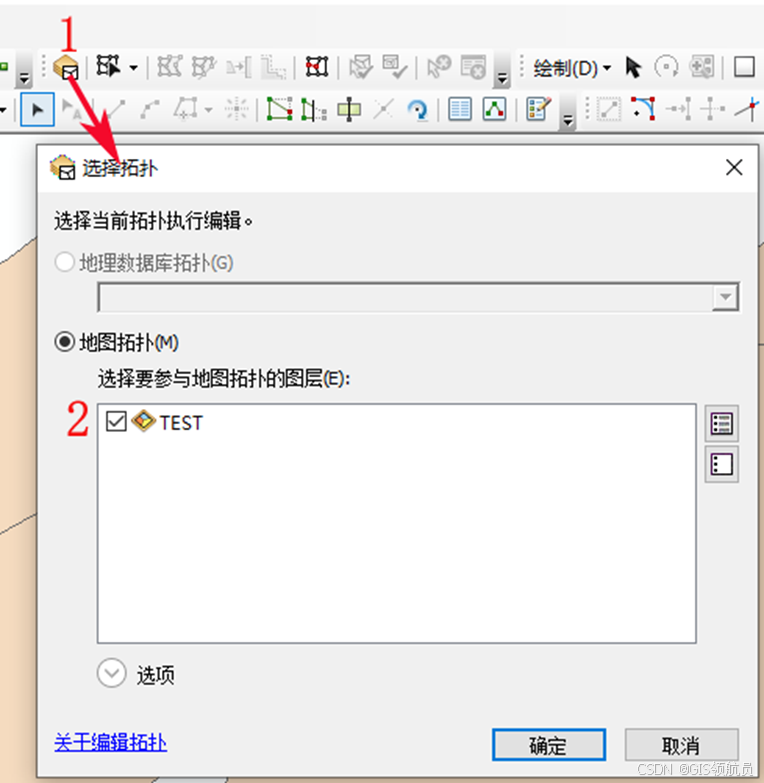 开始编辑,点击1处,弹出选中拓扑对话框,勾选要编辑的图层。