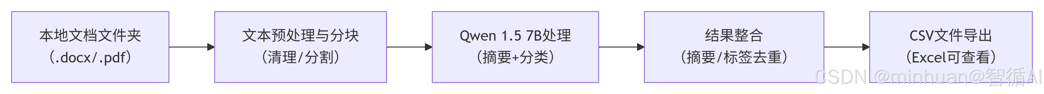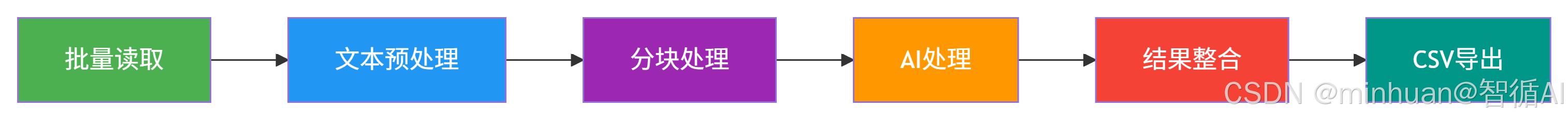 批量文档摘要与分类的核心逻辑是"批量读取→文本预处理→分块→AI处理→结果整合→CSV导出",每一步的作用如下: