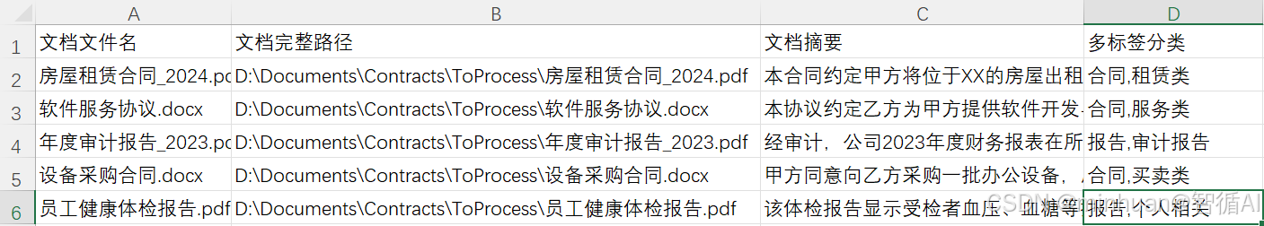 - 结果整合:将每份文档的「文件名→原文路径→完整摘要→多标签」整理为结构化数据。