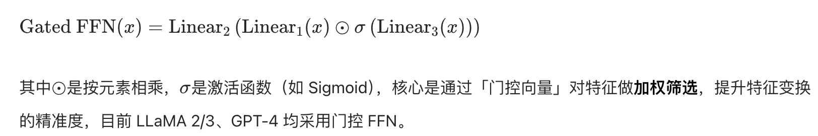 在基础 FFN 中加入门控机制,让模型能「自主选择」哪些特征需要加工,哪些特征需要保留: