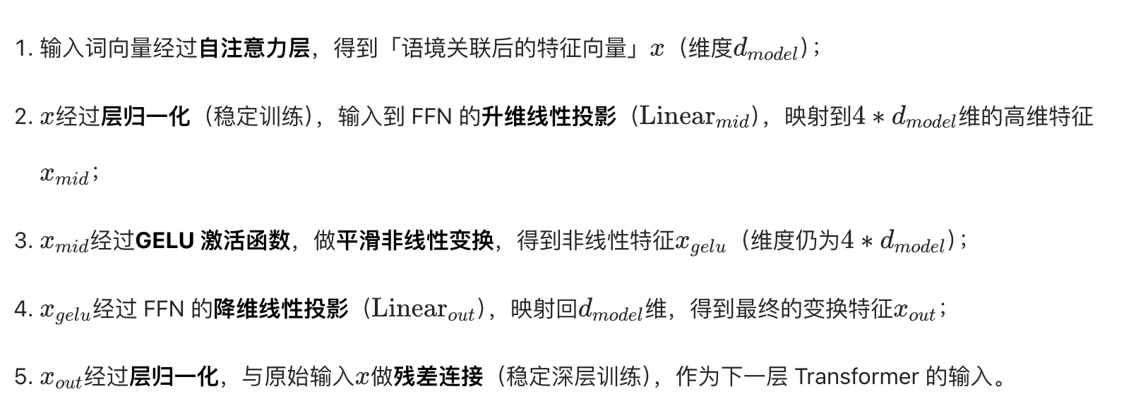 FFN + 激活函数:核心做特征的深度非线性变换,对自注意力层输出的「关联特征」做精细加工(比如抽象语义、编码搭配、融合情感),输出的是「加工后的特征向量」