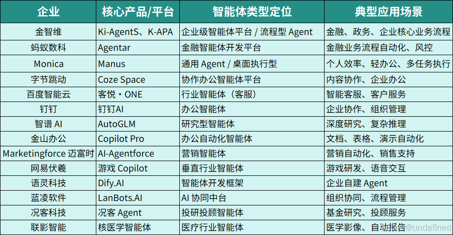 这类厂商的共同点是:场景明确、价值闭环清晰,但智能体能力高度依赖行业Know-how,很难横向复用。