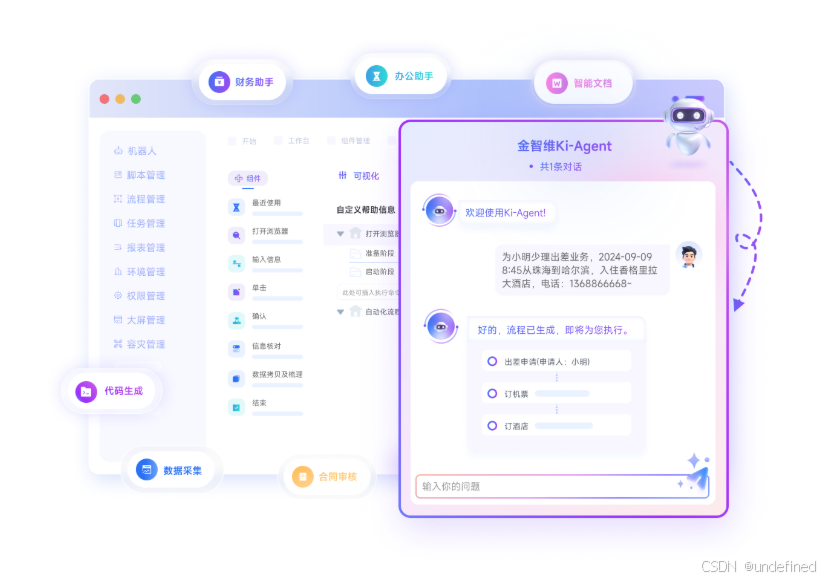 以金智维为例,其Ki-AgentS采用"受监督智能体架构",强调智能体并非完全黑盒自治,而是运行在可配置、可审计的框架之中;同时,通过K-APA提供的流程自动化与执行引擎,将"会规划"的能力真正落到"能执行"的系统层面。