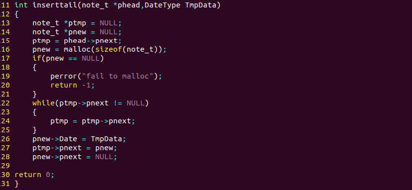 2.封装函数实现尾插法: int InsertTailLinkNode(Node_t *phead, DataType TmpData);