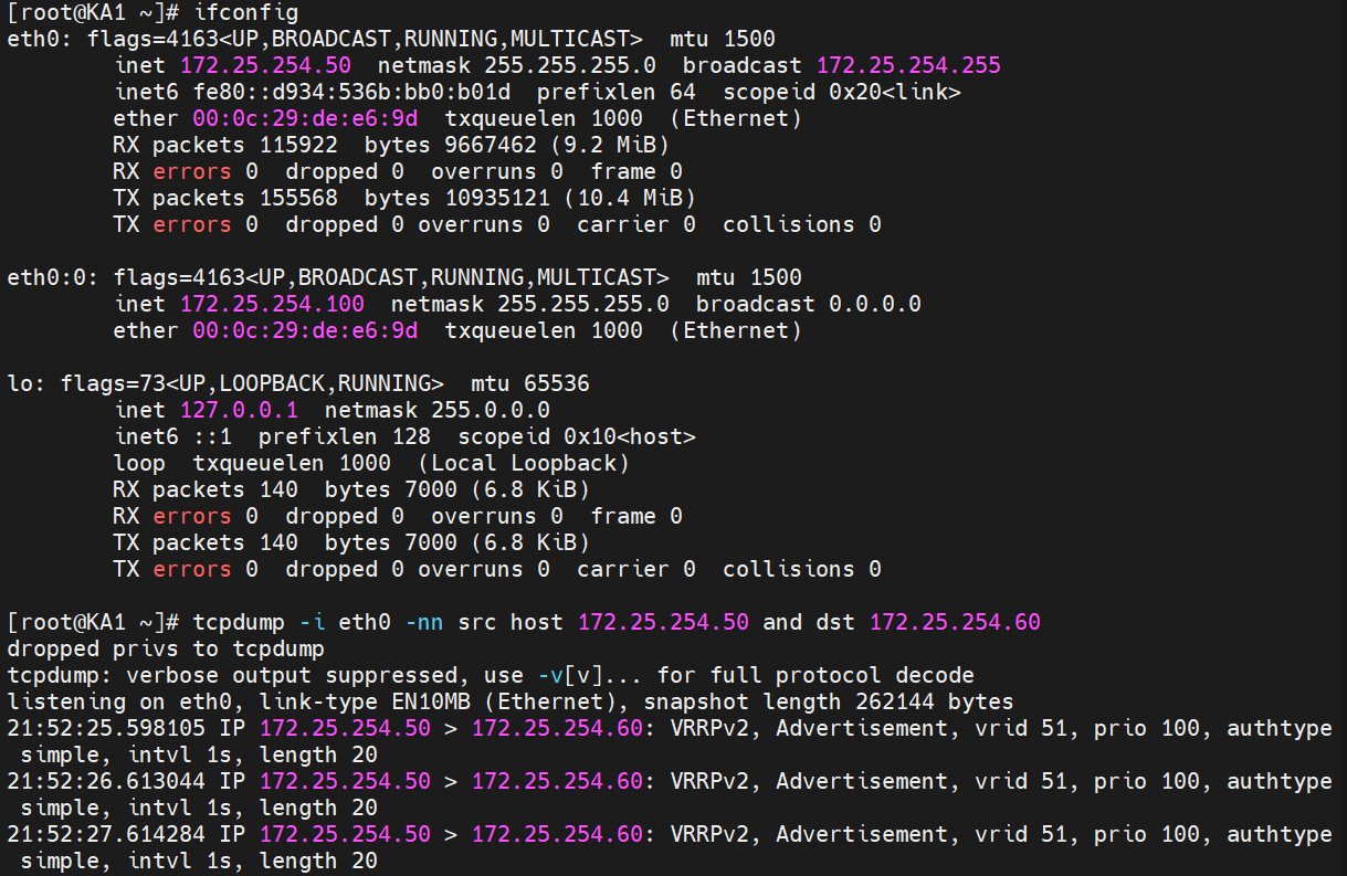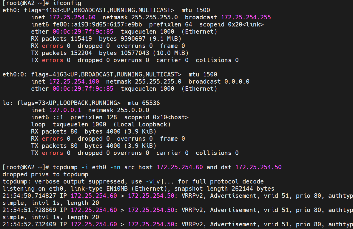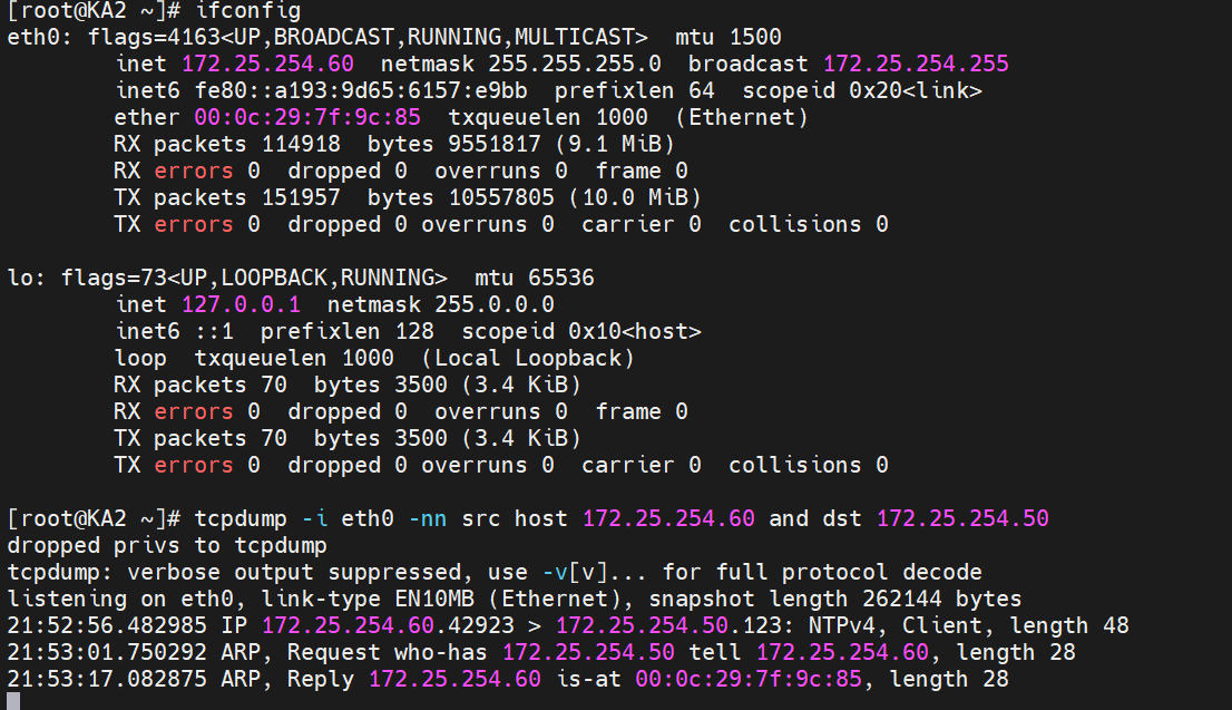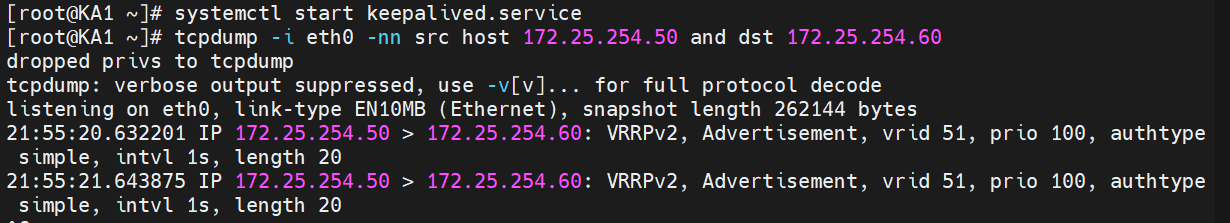 [root@KA1 ~]# tcpdump -i eth0 -nn src host 172.25.254.50 and dst 172.25.254.60