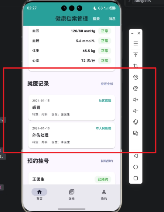 在本案例中,我们将实现 就医记录模块,用户可以查看历史就诊记录,并直观了解时间、医院、科室、医生以及诊断信息。