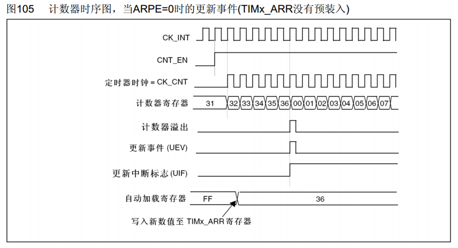 此时 TIMx_ARR 寄存器值为 FF,理论上计数器需计数到 FF 才会溢出;但软件在计数至 36 前写入了新 ARR 值 36,触发关键变化。
