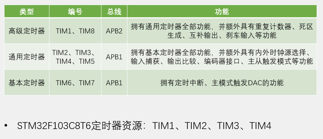 不仅具备基本的定时中断功能,而且还包含内外时钟源选择、输入捕获、输出比较、编码器接口、主从触发模式等多种功能