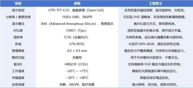 高像素密度(386PPI)配合全视角AAS技术,可用于近眼显示模组,如头显或智能眼镜。