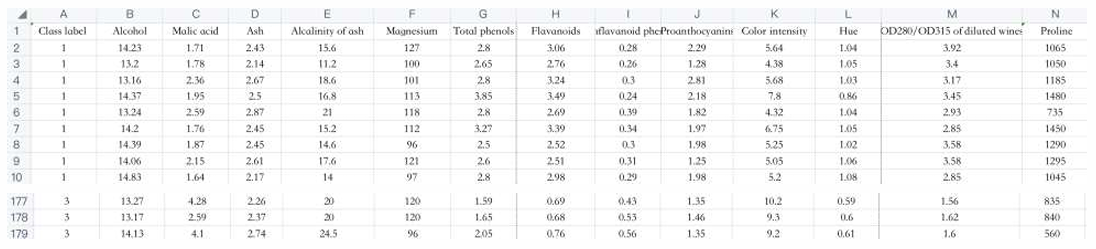 Class label Alcohol Malic acid Ash Alcalinity of ash Magnesium ... Nonflavanoid phenols Proanthocyanins Color intensity Hue OD280/OD315 of diluted wines Proline