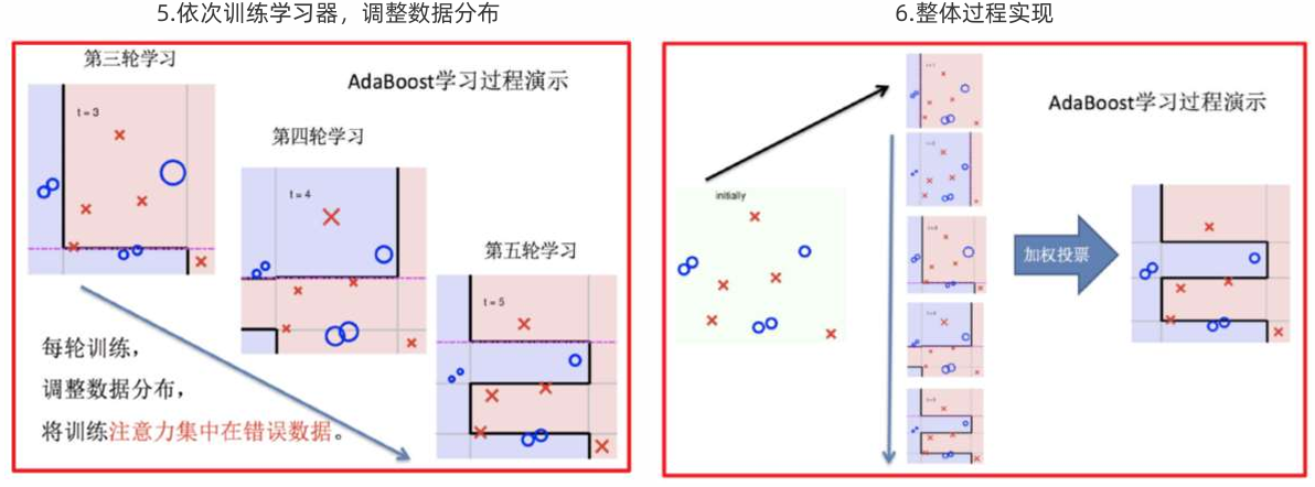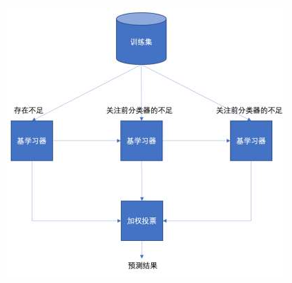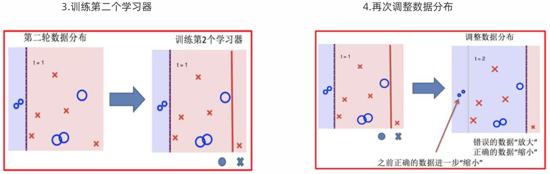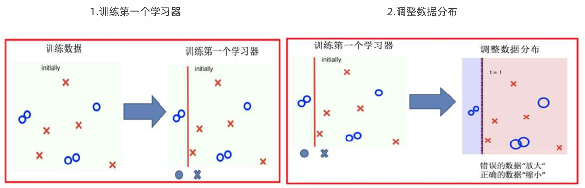 • 每一个训练器重点关注前一个训练器不足的地方进行训练