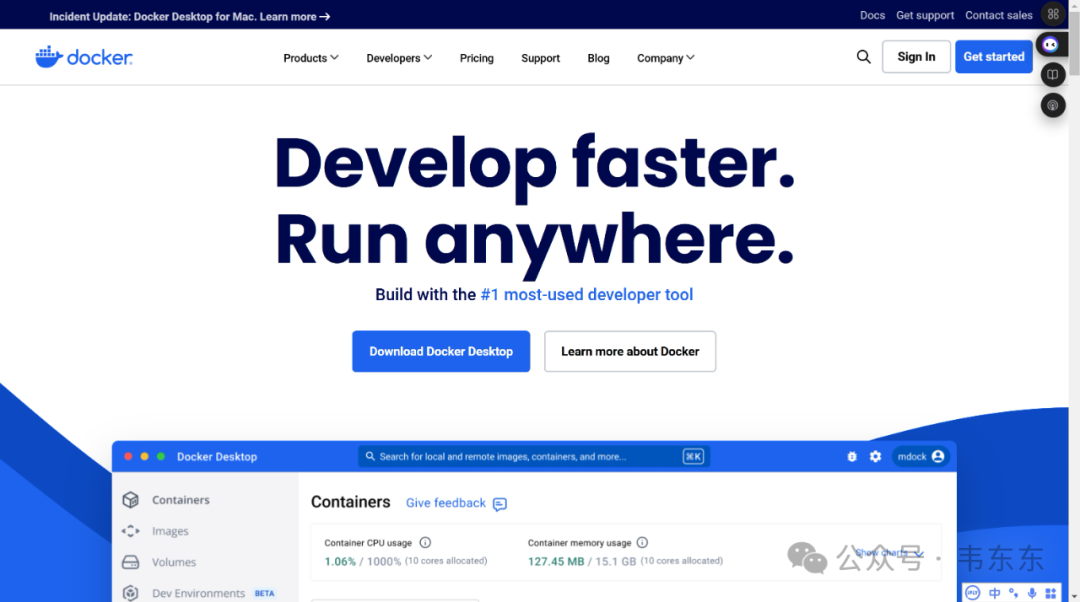 直接点击官方 https://www.docker.com/, 下载适合自己电脑的版本。