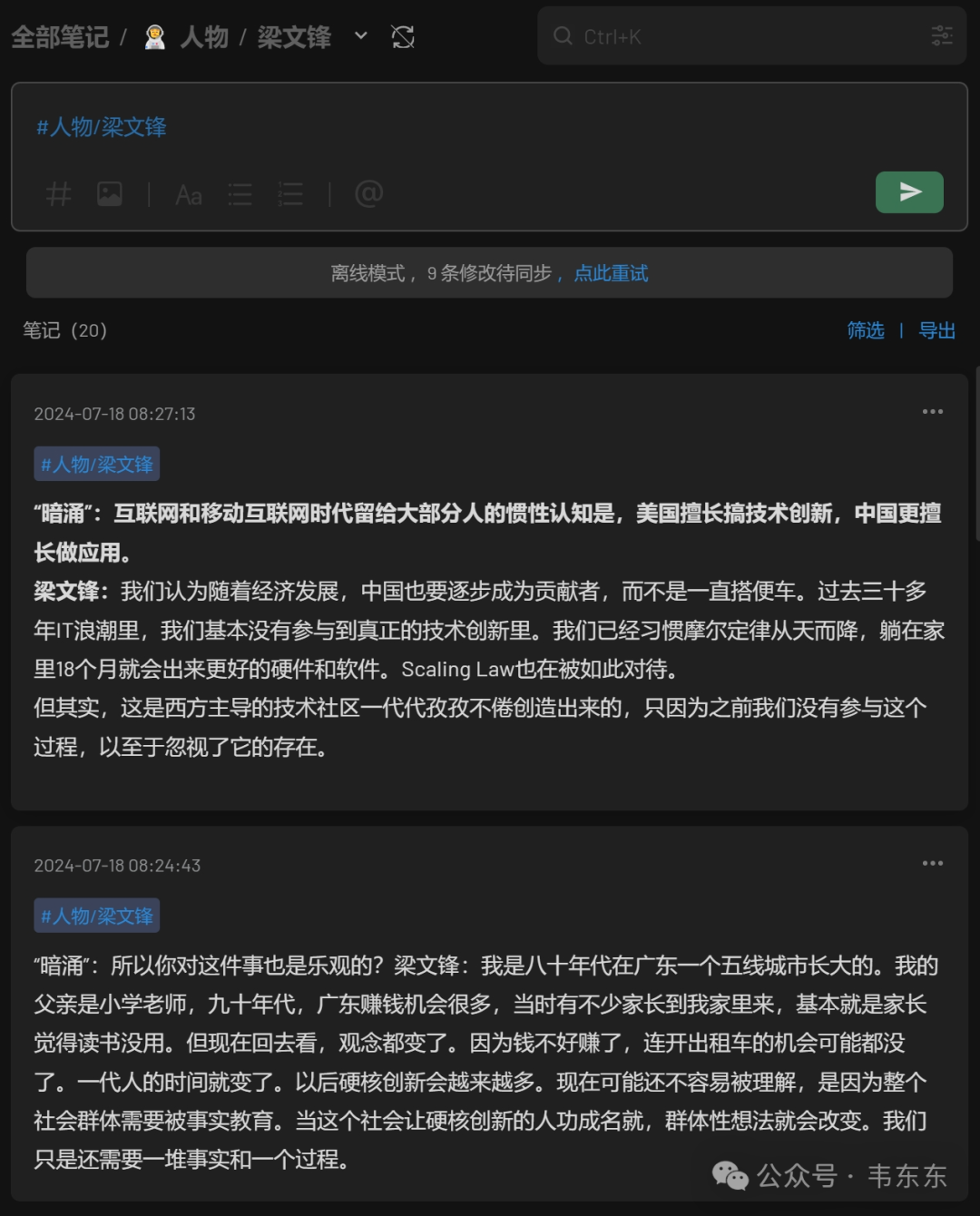 24 年 7 月读完暗涌那篇《揭秘 DeepSeek:一个更极致的中国技术理想主义故事》后,在flomo上记下了其中非共识的对话,也忽然意识到,或许梁文锋就是在践行段永平口中所谓"做对的事情,把事情作对",一切信念都基于对真正价值的尊重和判断。