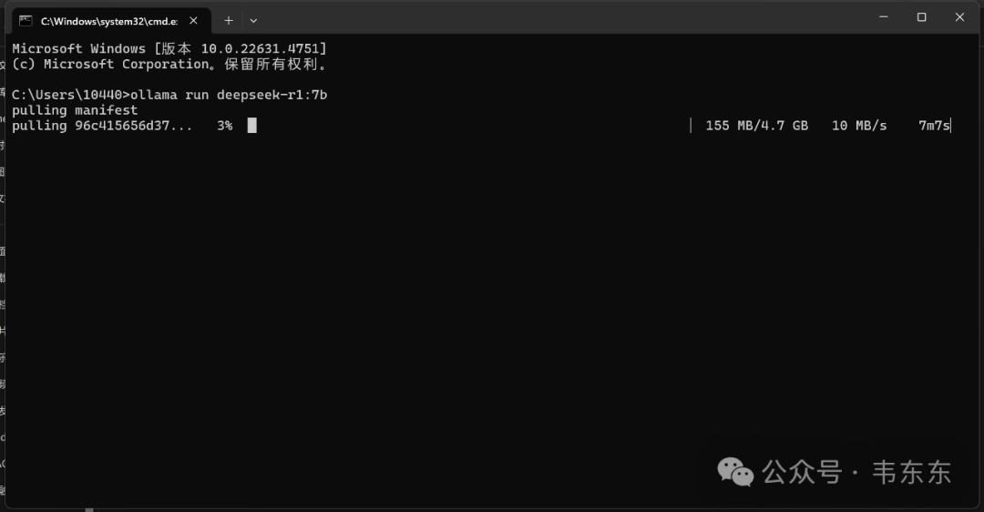 以 Distill-Qwen-7B 为例,在电脑终端中输入:ollama run deepseek-r1:7b,7b 的模型大概 4.7G 大小,等待模型下载完成之后即可在终端中输入问题进行测试。下一步会演示如何在 open webui 中使用。