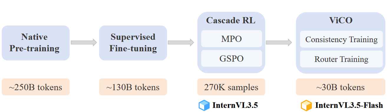 - ViCO:视觉一致性训练,旨在将视觉分辨率路由器(ViR)集成到InternVL3.5中,以构建InternVL3.5-Flash,通过最小化不同视觉压缩率的输出偏差。