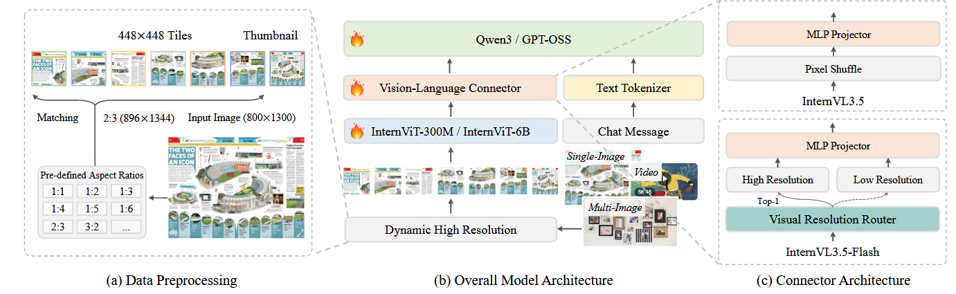 - internVL-3.5-Flash继承了视觉分辨率路由器(ViR)。在internVL-3.5中image patch以1024个image token表征,并通过pixel shuffle模块呀u送为256个tokens,而对于Flash, 则将其压缩为64 tokens。而对于每个patch,路由器通过评估其语义丰富性来确定适当的压缩率,并相应地将其路由到相应的像素洗牌模块。