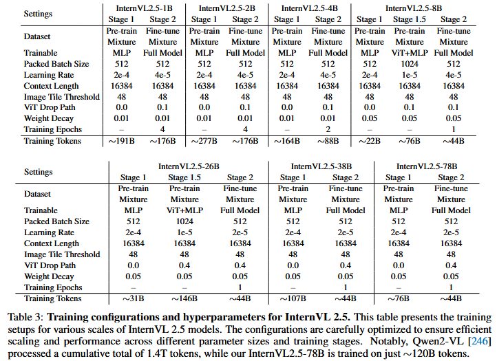 表3展示了internVL-2.5各版本训练的超参数与tokens总数
