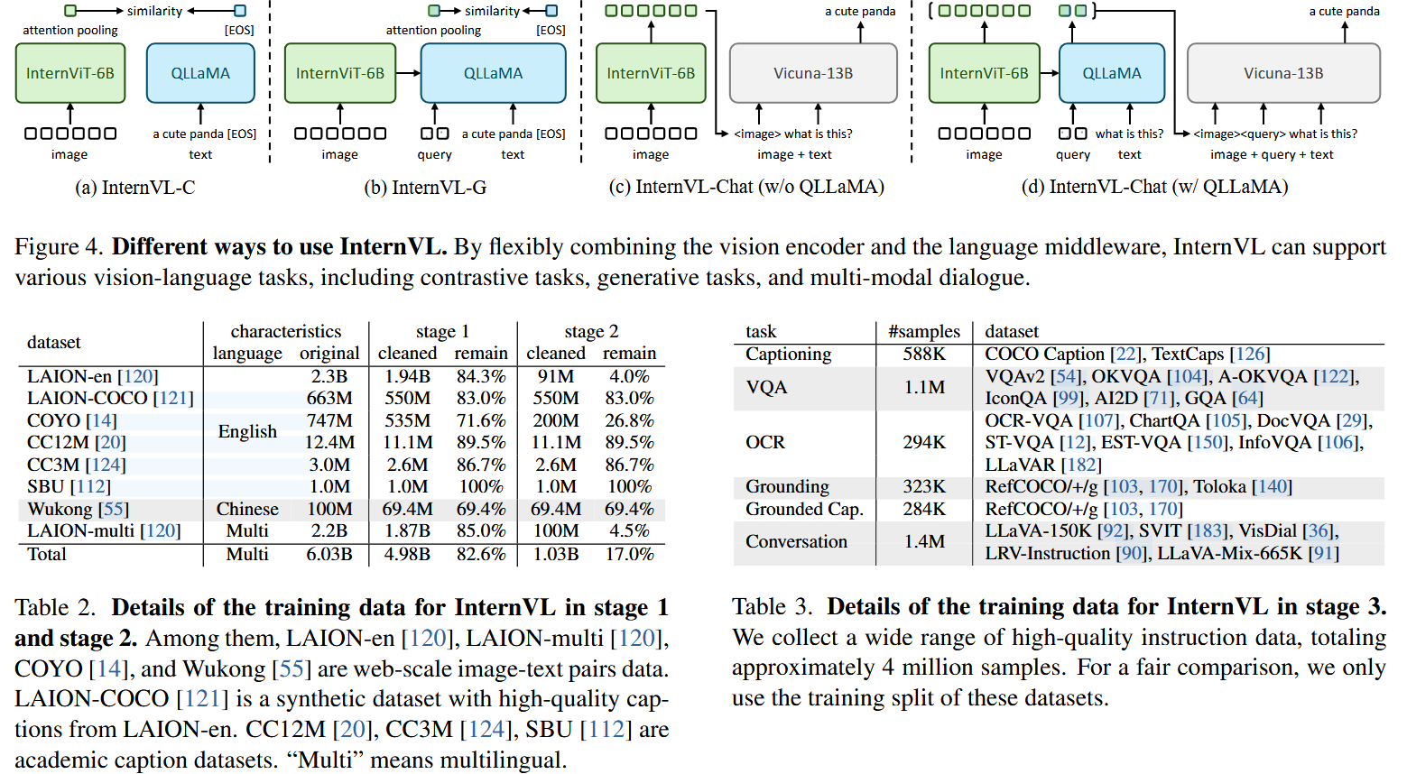 架构上,internVL与传统的单塔或双塔结构不同,根据任务的不同,internVL会采用不同的输入配置