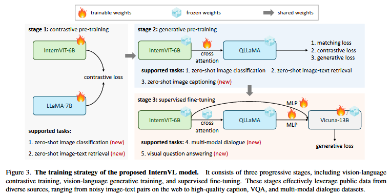 - 预训练阶段:仅训练internViT-6B与投影MLP层来优化视觉特征提取