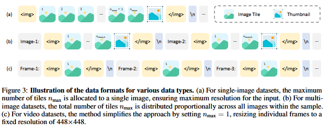 - 图像分割与全局缩略图:除了patch,模型还会输入全局缩略图(448×448),兼顾局部细节与全局信息,训练过程中,视觉标记的数量范围从 256 到 3,328。在测试时,tiles的数量最多可以增加到 40,从而产生 10,496 个视觉标记。