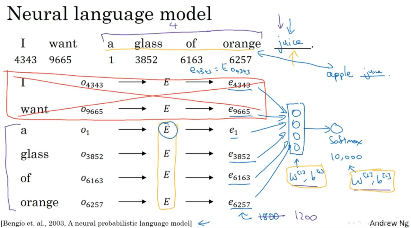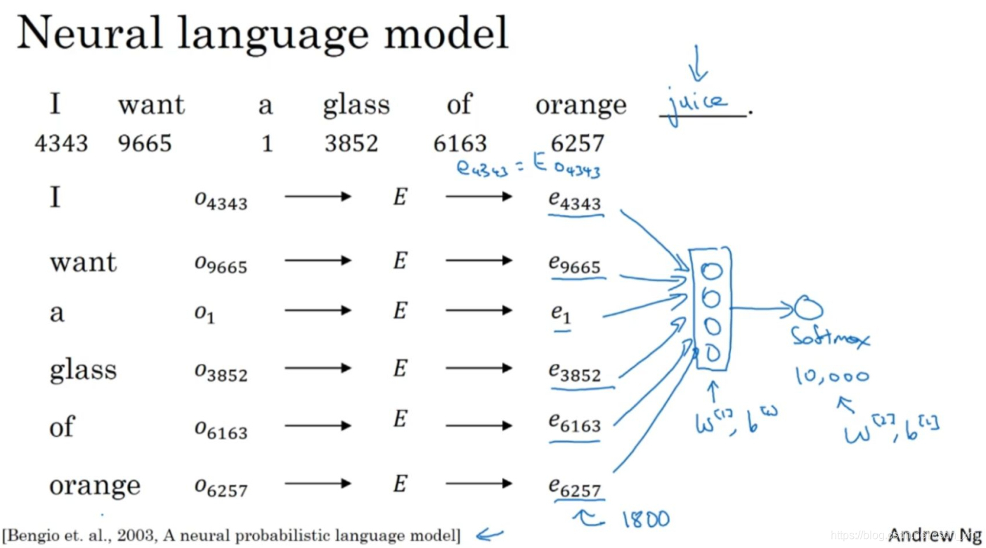 - 第一种训练方式是:先把输入的每个词都用一个one-hot向量表示。然后生成一个参数矩阵E,用E乘以one-hot向量,得到嵌入向量。于是现在你有许多300维的嵌入向量。我们能做的就是把它们全部放进神经网络中,经过神经网络以后再通过softmax层,这个softmax也有自己的参数,然后这个softmax分类器会在10,000个可能的输出中预测结尾这个单词。假如说在训练集中有juice这个词,训练过程中softmax的目标就是预测出单词juice。如果它们用的是300维大小的嵌入向量,而这里有6个词,所以用6×300的输入会是一个1800维的向量。