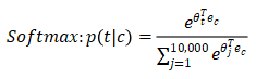 - 在这个神经网络中,把向量e_c喂给一个softmax单元,softmax单元要做的就是输出y帽。下面为softmax模型预测不同目标词概率的公式: