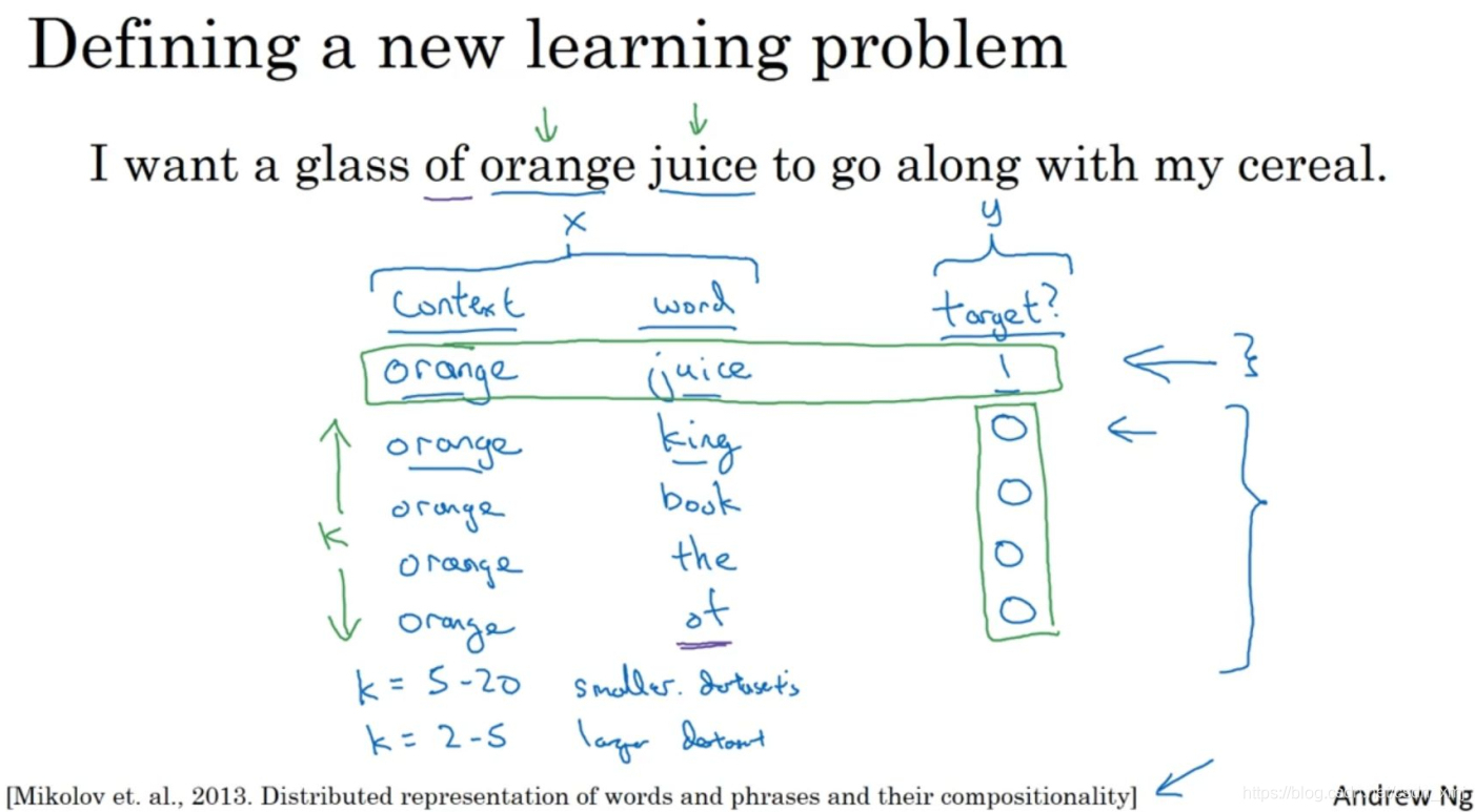 - 比如:还是这个句子:"I want a glass of orange juice to go along with my cereal.",orange和juice就是个正样本(标为1),那么orange和king就是个负样本(标为0)