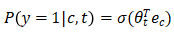 - 先来看softmax模型: 用记号c表示上下文词,记号t表示目标词,y表示0和1,表示是否是一对上下文-目标词。我们定义一个逻辑回归模型,给定输入的c,t对的条件下,y = 1的概率,即: