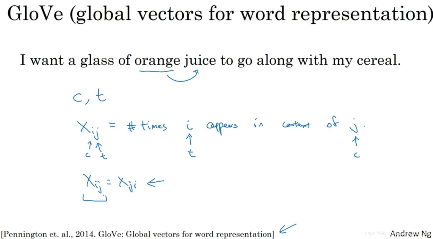 - X_ij表示单词i在单词j上下文中出现的次数,那么i和j相当于t和c,可以把X_ij等同于X_tc。事实上,如果你将上下文和目标词的范围定义为出现于左右各10词以内的话,X_ij和X_ji有一种对称关系。如果你选择的上下文总是目标词前一个单词的话,那么X_ij和X_ji就不对称。