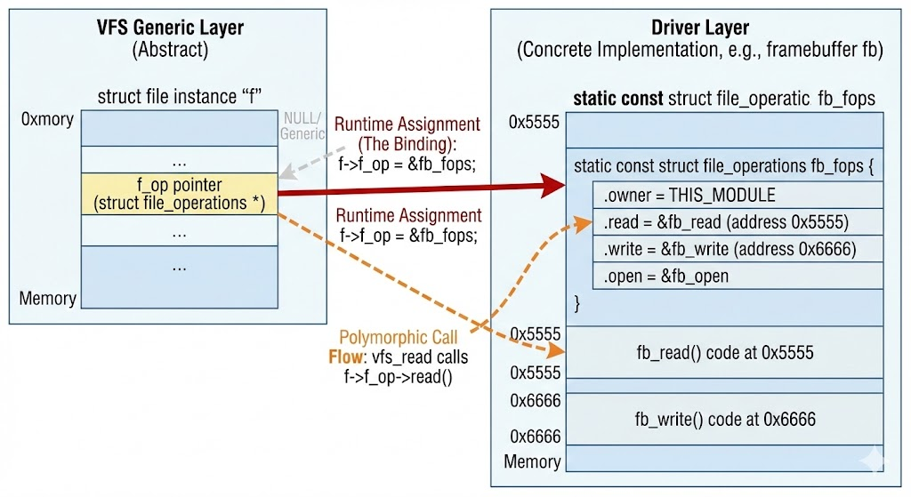 这就是多态! vfs_read 函数根本不在乎它读的是什么,它只管调用 f_op->read。