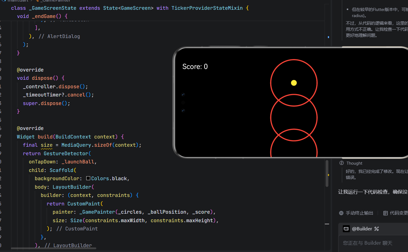 在上一篇《主菜单与最高分存储》中,我们搭建了游戏的基础架构。本篇将聚焦核心玩法实现------一个类似"球跳环"的休闲游戏:玩家点击屏幕,小球沿当前圆环切线方向发射,若成功落入下一个圆环,则继续前进;否则游戏结束。